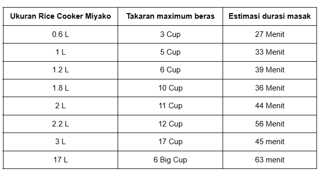Berikut durasi menanak nasi dengan berbagai macam ukuran Rice Cooker Miyako jika dimasak dalam full kapasitas: