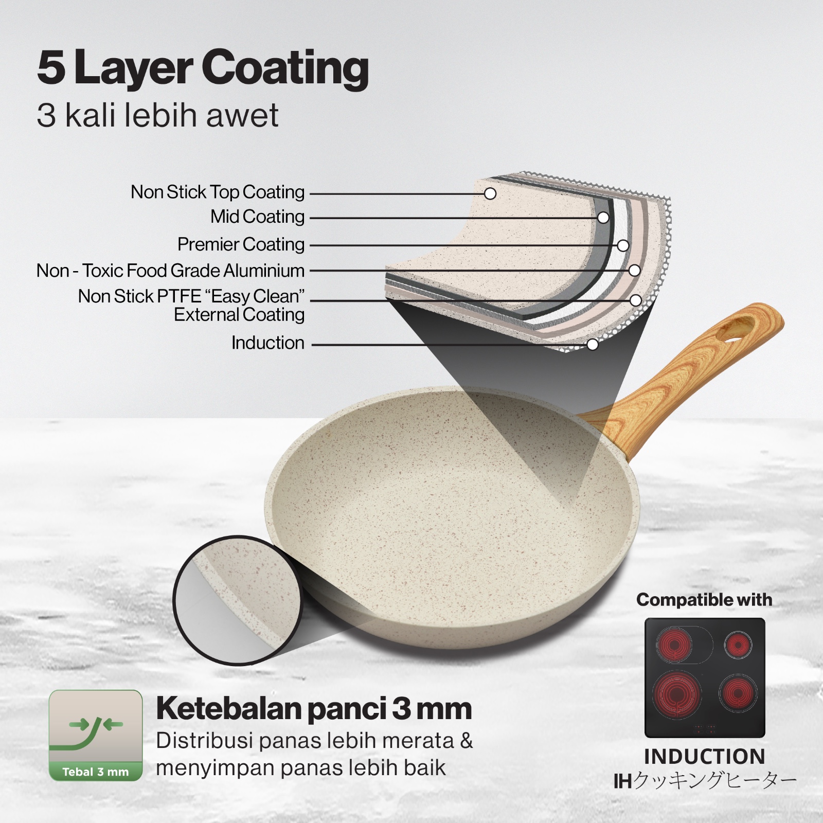 - Dilengkapi 5 layer coating, 3x lipat lebih awet dan lebih kokoh