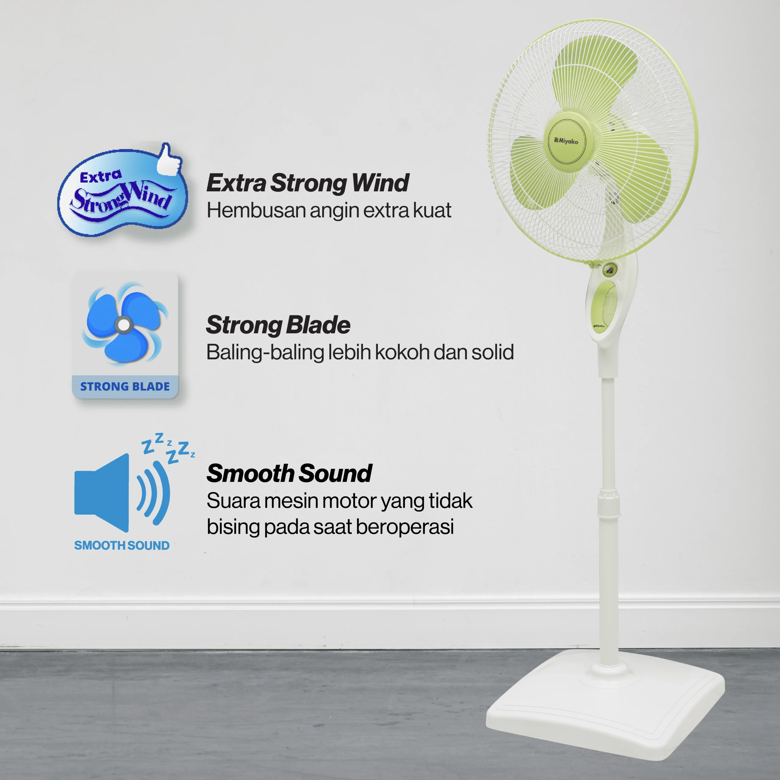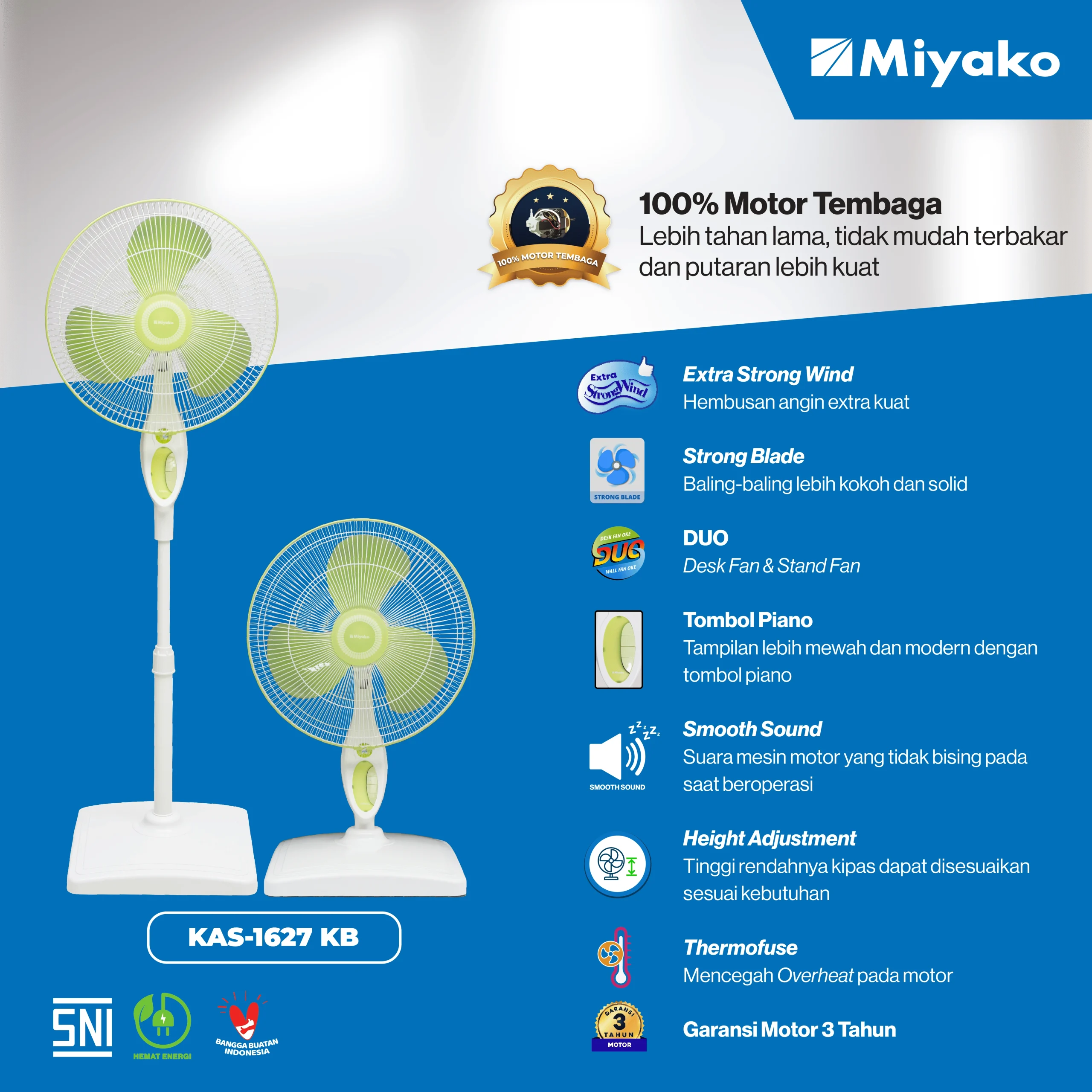 Kipas Angin Miyako KAS-1627 KB merupakan kipas angin berukuran 16 inch dengan fungsi “DUO” sebagai Stand Fan dan Desk Fan. Dilengkapi Motor Kipas 100% Tembaga yang berpadu dengan baling – baling berbahan solid dan kokoh (Strong Blade) sehingga KAS-1627 KB dapat menghasilkan angin ekstra kencang (Extra Strong Wind) namun tetap hening dan tidak bising saat beroperasi (Smooth Sound)