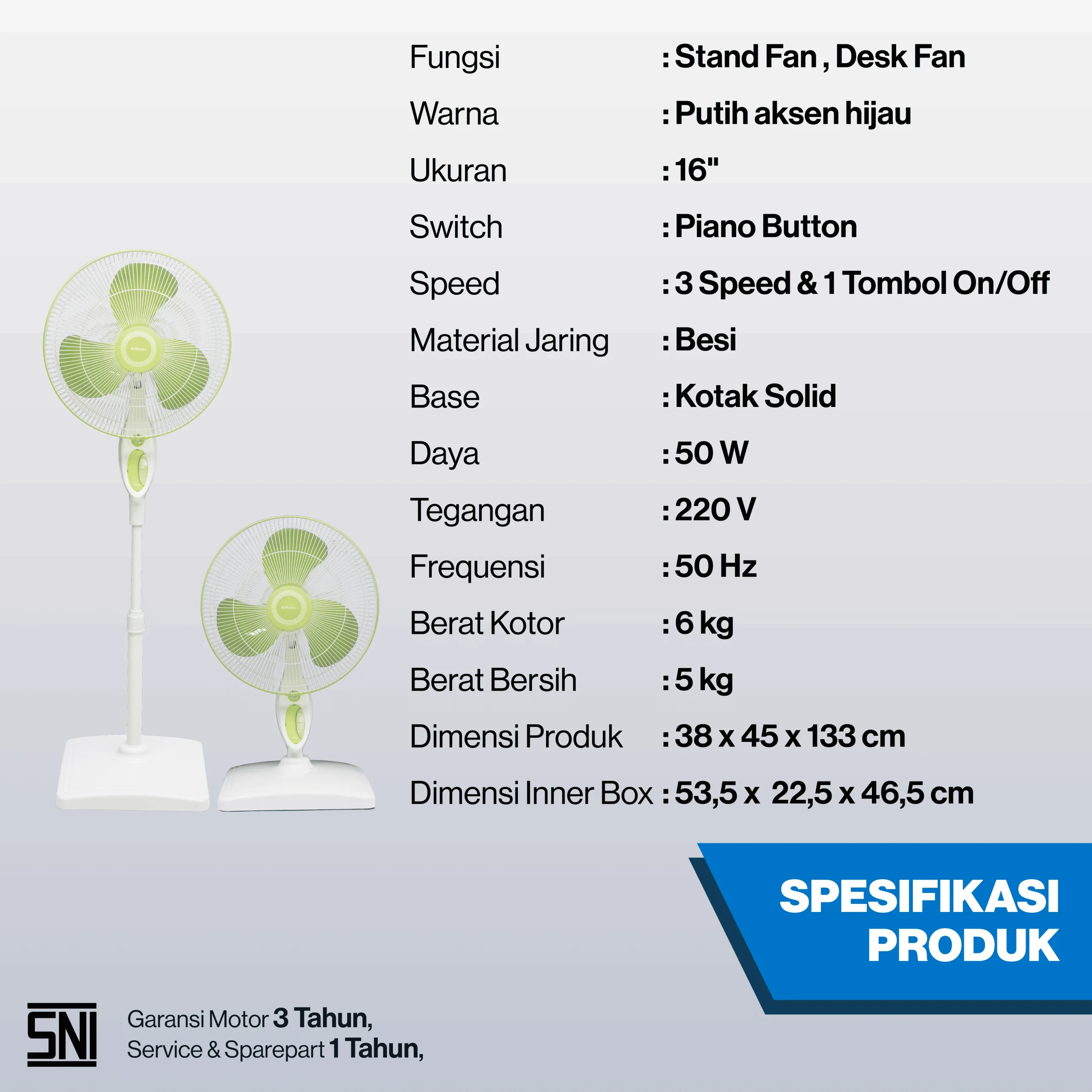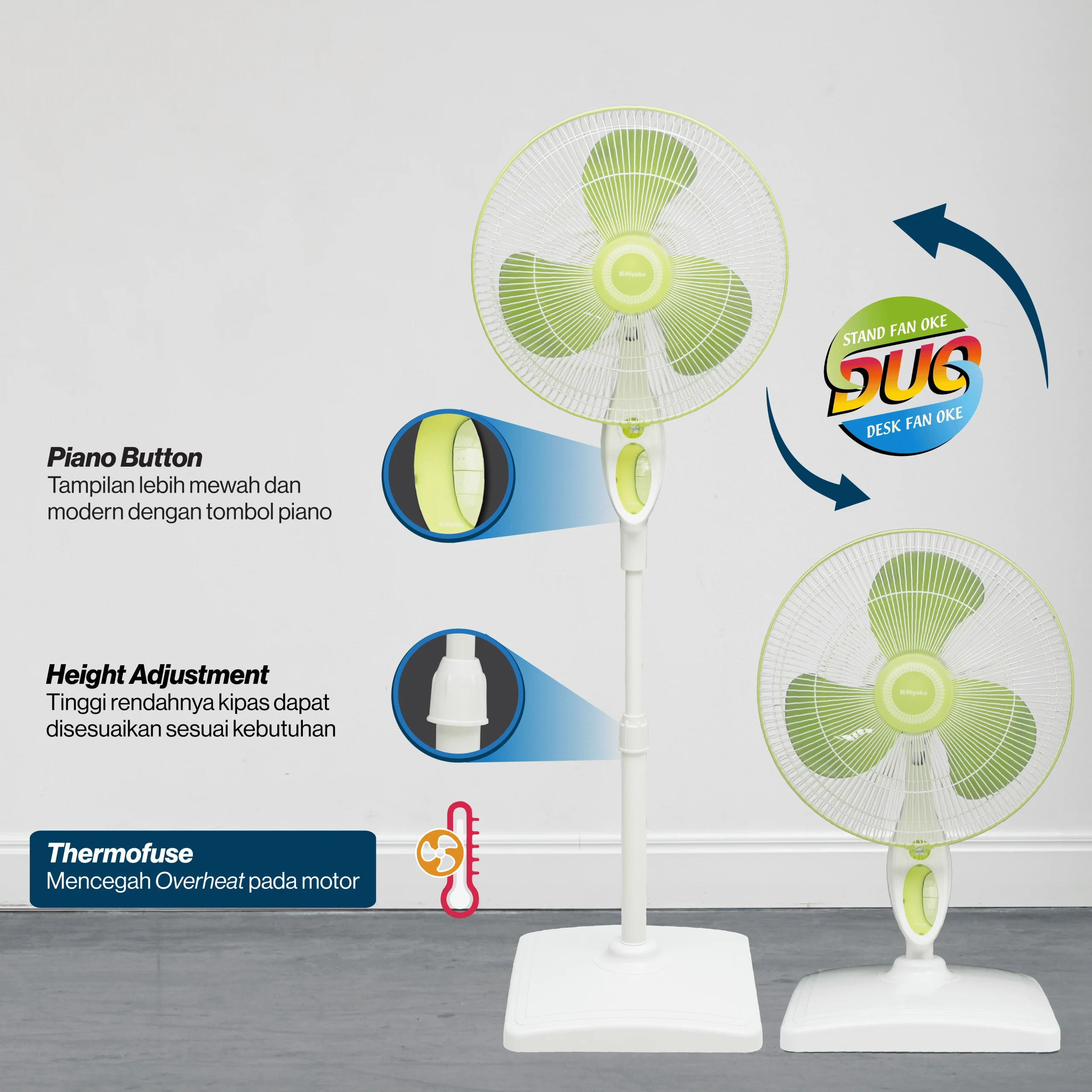 • DUO fungsi yang dapat dijadikan sebagai kipas berdiri (Stand Fan) maupun kipas meja (Desk Fan)