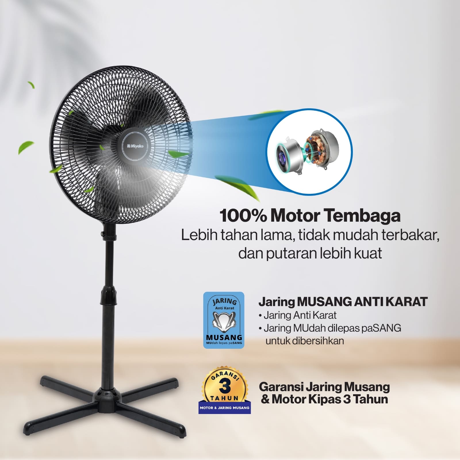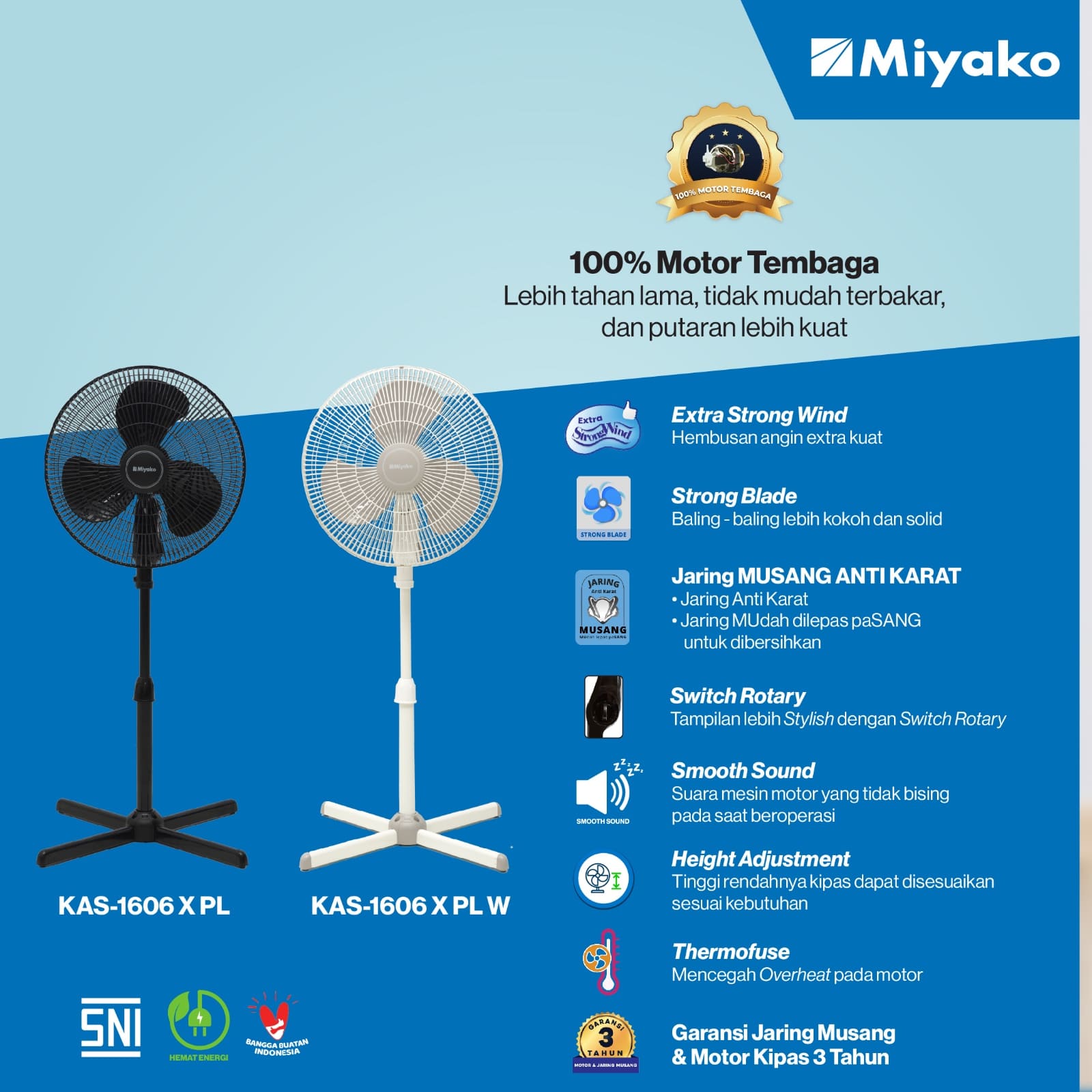 KAS-1606 X PL telah memenuhi standar SNI karena memiliki beragam fitur terbaik. Salah satu pelengkap terbaiknya adalah fitur Thermofuse yaitu fitur keamanan yang dapat memutuskan arus listrik jika motor kipas mengalami overheat. Kipas Angin Miyako juga memberikan garansi selama 3 tahun untuk Jaring Anti Karat dan Motor Kipas.