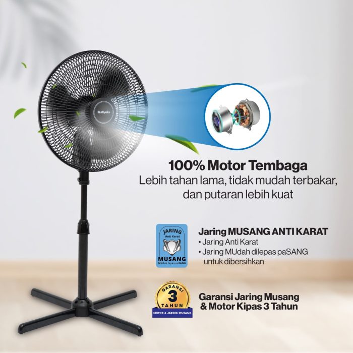 Kipas Angin Miyako KAS-1606 X PL mudah dibersihkan berkat fitur JARING ANTI KARAT yang mudah dilepas pasang untuk dibersihkan. Membuat kipas angin lebih bersih, bebas karat, dan bebas dari udara kotor.