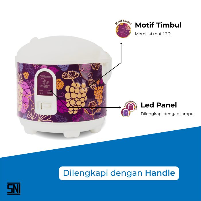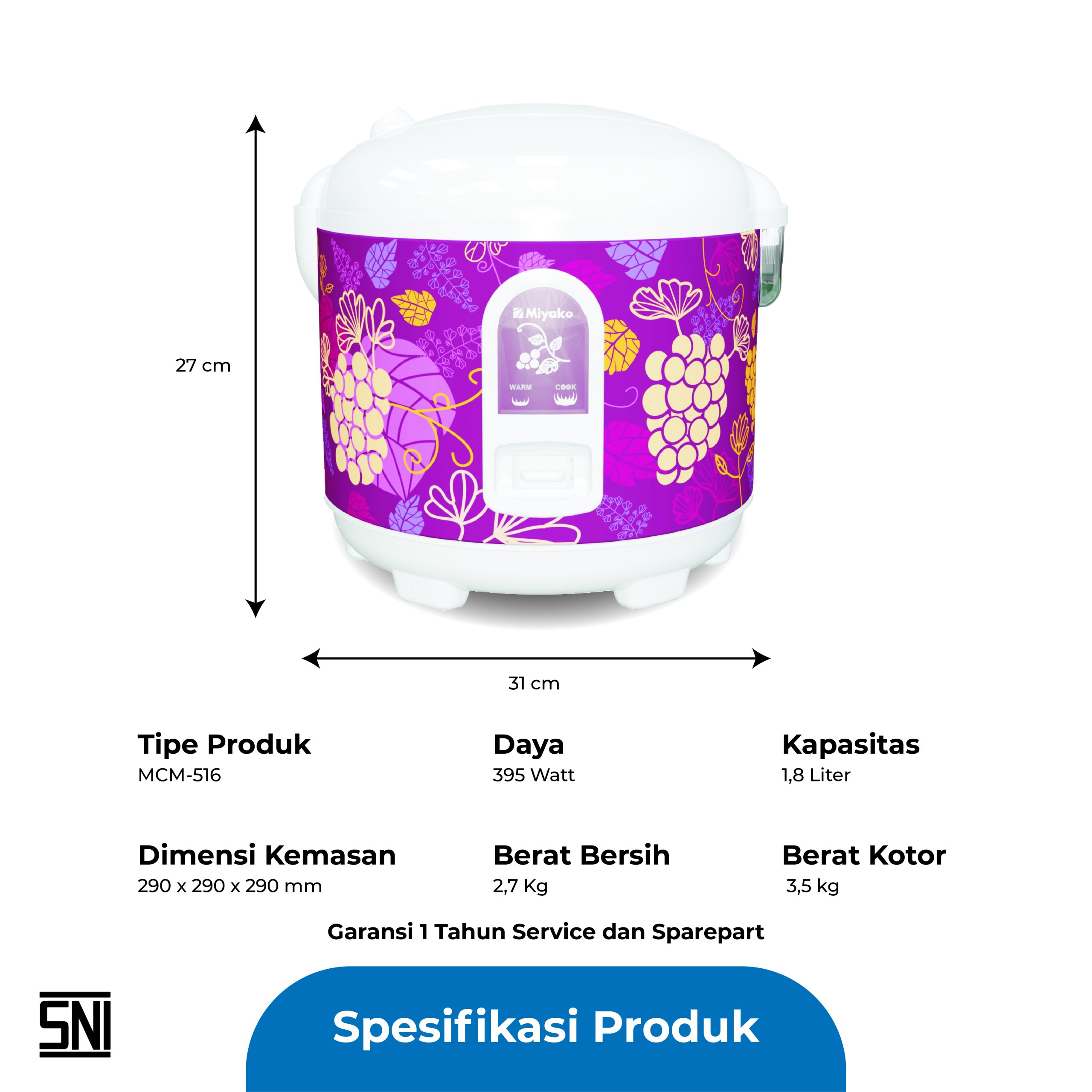 MCM-516 dibalut body berbahan Tin Plate berwarna Ungu dengan motif buah berbentuk 3D yang unik. Sebagai penunjang desain, pada bagian indikator dilengkapi fitur LED Backlight untuk membuat tampilan rice cooker lebih mewah. Rice Cooker Miyako MCM-516 memiliki Fungsi 3 in 1 yang sangat praktis digunakan untuk memasak dan menghangatkan sekaligus mengukus. Dilengkapi fitur Thermostat System untuk menjaga nasi agar tetap hangat, tidak mudah kering dan tidak mudah basi.