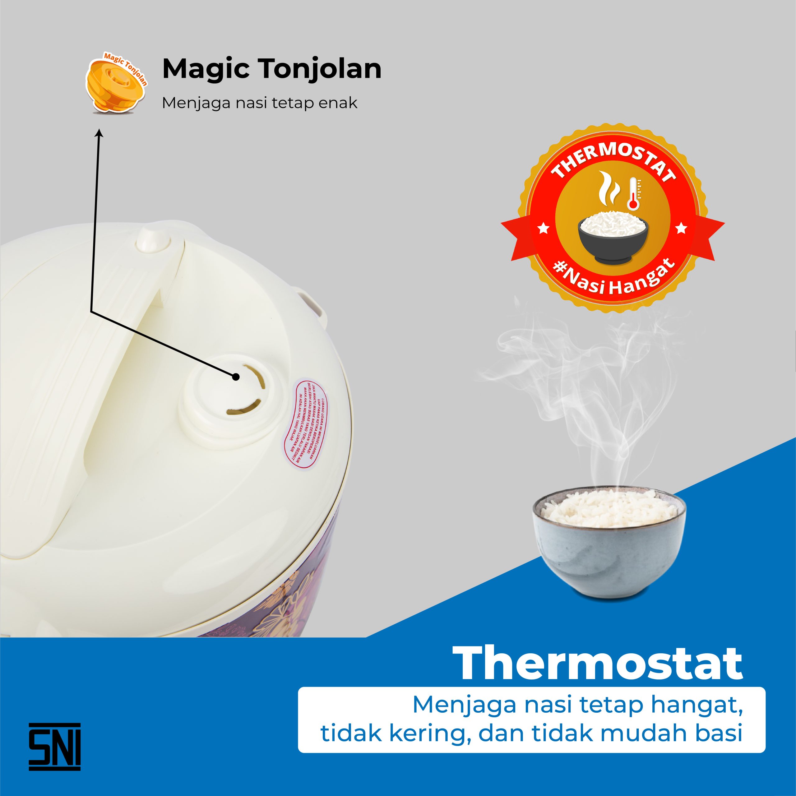 - Fitur Thermostat System yang dapat menjaga nasi tetap hangat, tidak kering, dan tidak mudah basi