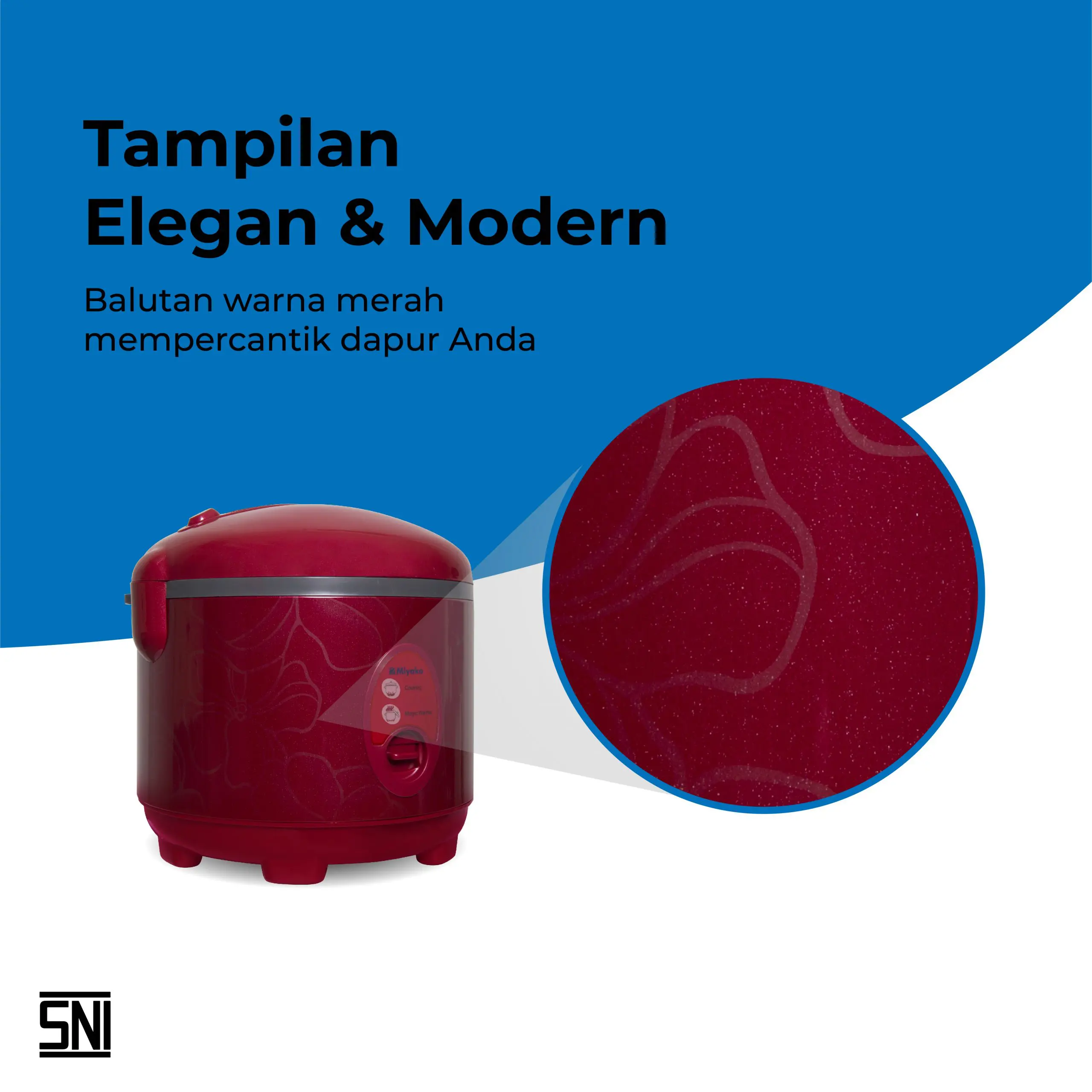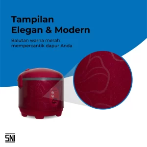 Merupakan penanak nasi dengan warna merah yang akan mempercantik dapur Anda. Memiliki fungsi 3 in 1 yaitu sebagai pemasak nasi, mengukus, dan menghangatkan makanan. Bagian inner pot yang terbuat dari material berkualitas tinggi menjadikannya anti lengket, tidak mudah tergores dan sangat mudah untuk dibersihkan. Memiliki 3 element pemanas dibagian atas, tengah dan bawah yang menjadikan nasi matang lebih sempurna dan tahan hangat lebih lama.