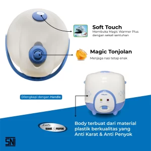 Magic warmer ini memiliki kapasitas besar hingga 1.8 liter untuk memasak dan 5 liter untuk menghangatkan makanan, sehingga memudahkan Anda memasak dalam jumlah besar. Magic warmer ini juga dilengkapi dengan gelas pembuangan air dibagian belakang yang menampung air sisa memasak dan menjadikan nasi tidak mudah busuk. Dilengkapi dengan fitur SNI dan food grade, dengan desain bunga cantik dan elegant Magic Warmer ini sangat cocok untuk diletakan di dapur ataupun ruang makan Anda.