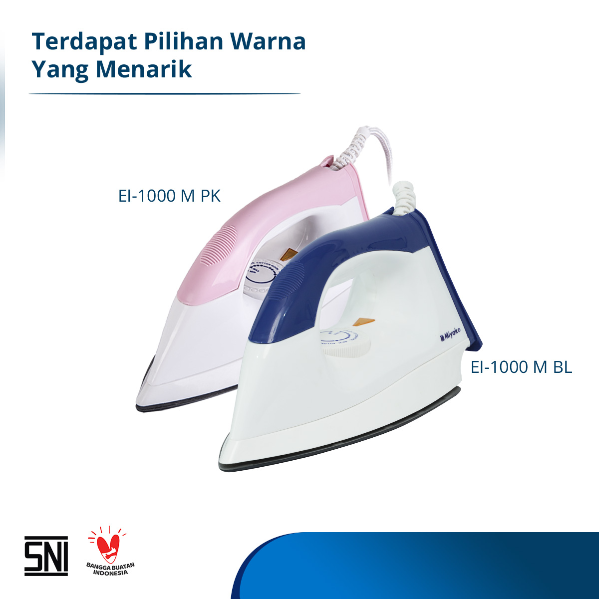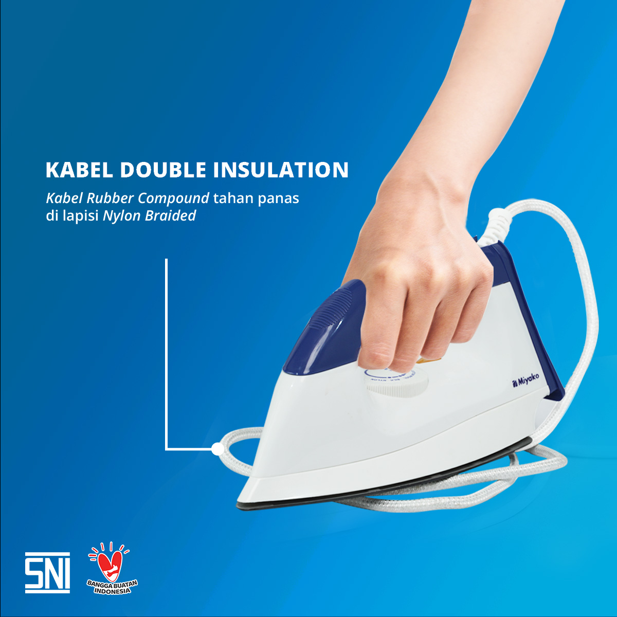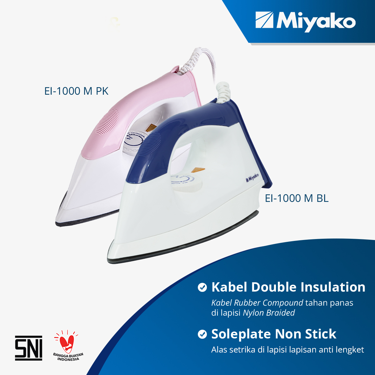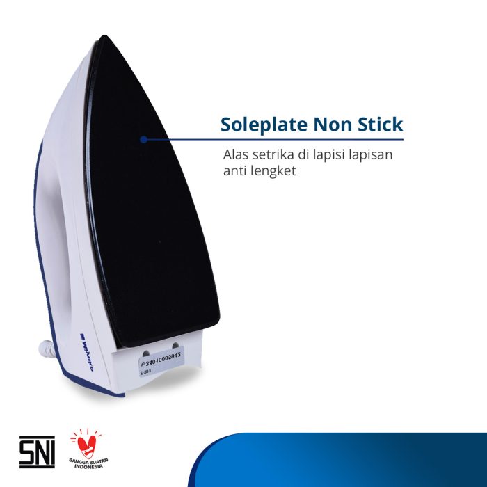 Merupakan setrika listrik fungsional dengan harga yang ekonomis. Setrika ini memiliki alas setrika (sole plate) dengan bahan berkualitas sehingga alas anti lengket dan lebih licin, jadi kegiatan menyetrika lebih mudah dan nyaman. Pelindung kabel listrik dengan double insulation (nylon braided dan rubber compound) yang melindungi kabel setrika agar lebih tahan lama dan aman.