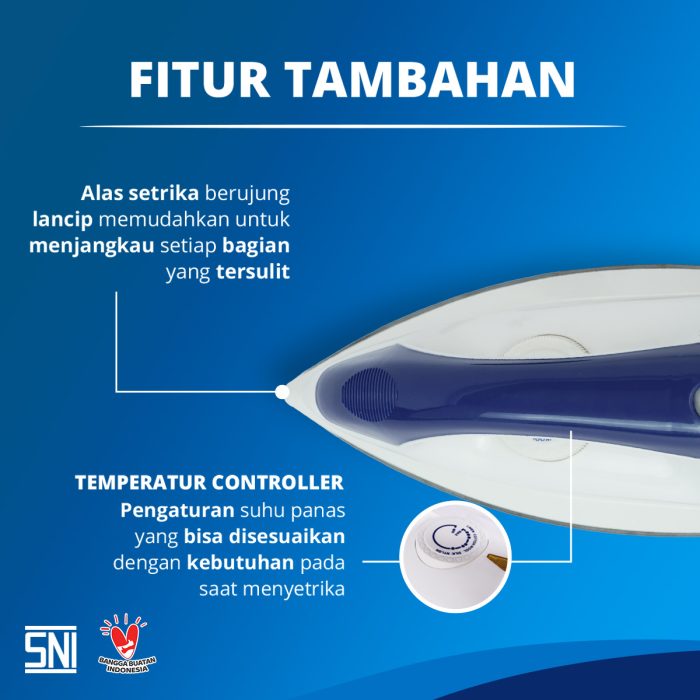 Setrika yang dilengkapi dengan temperature controller untuk mengatur suhu sesuai dengan kebutuhan dan indicator lamp yang menandakan setrika sudah siap untuk digunakan. Bentuk alas setrika yang lancip menjadikan kegiatan menyetrika lebih mudah apalagi untuk bagian – bagian yang sulit seperti kerah, kancing dan lipatan baju. Handle yang ergonomis menjadikan kegiatan menyetrika lebih nyaman dan standar SNI yang menjaga keaman produk.